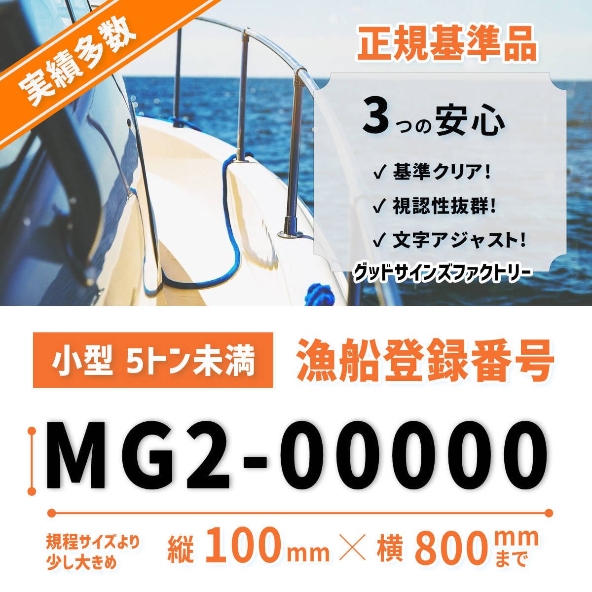 この漁船登録番号は、規定をクリアしたサイズで製作されており、法律に基づいて漁業を行うための必須アイテムです。お取引内容など簡単にいたしますので、お気軽にご活用ください!